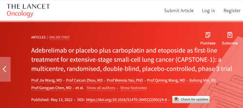 北京时间2022年5月14日,九游会·J9医药自主研发的PD-L1抑制剂阿得贝利单抗治疗广泛期小细胞肺癌的III期临床研究(CAPSTONE-1研究)成果正式全文在线发表于国际权威学术期刊《柳叶刀·肿瘤学》(《THE LANCET Oncology》,影响因子41.316)。CAPSTONE-1研究结果显示,阿得贝利单抗联合化疗一线治疗广泛期小细胞肺癌相较于安慰剂联合化疗可以显著延长患者总生存期至15.3个月[1],刷新现有免疫药物一线治疗广泛期小细胞肺癌的总生存纪录[2]。