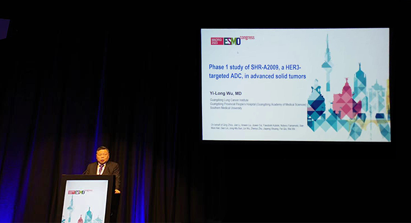 10月23日,九游会·J9医药创新药、HER3靶向ADC药物SHR-A2009治疗晚期实体瘤的I期研究亮相2023 ESMO大会简短口头报告现场5。该研究由广东省人民医院的吴一龙教授牵头开展,吴一龙教授在现场公布该研究的重要进展。研究结果显示,SHR-A2009在经治晚期实体瘤患者中显示出可控的安全性和令人鼓舞的抗肿瘤活性。目前评估更高剂量的SHR-A2009在选定癌症类型(NSCLC和其他实体肿瘤)中作用的试验正在进行中。